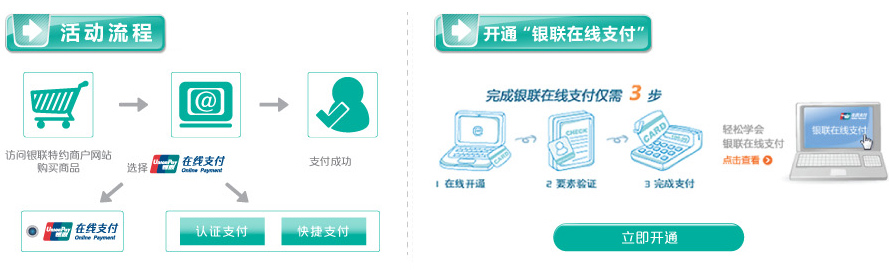 - "银联在线支付"注册与使用非常便捷,只需一分钟即可完成开通,而且使用"银联在线支付"付款,无需网银,只要输入必须的认证信息,即可完成支付。
