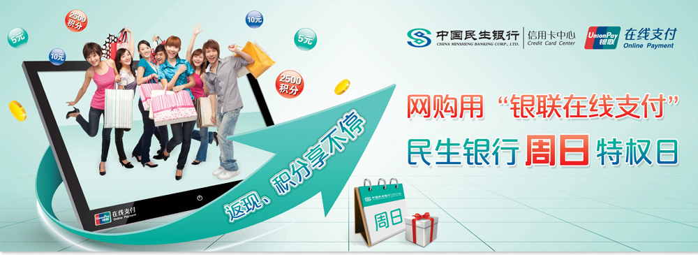 活动期间,每逢周日,凡中国民生银行信用卡持卡人通过"银联在线支付"认证支付或快捷支付单笔订单交易满99元(含)及以上可获赠5元返现和2500民生信用卡积分,当日限前1000名用户,同一用户每周限获奖一次,先到先得。