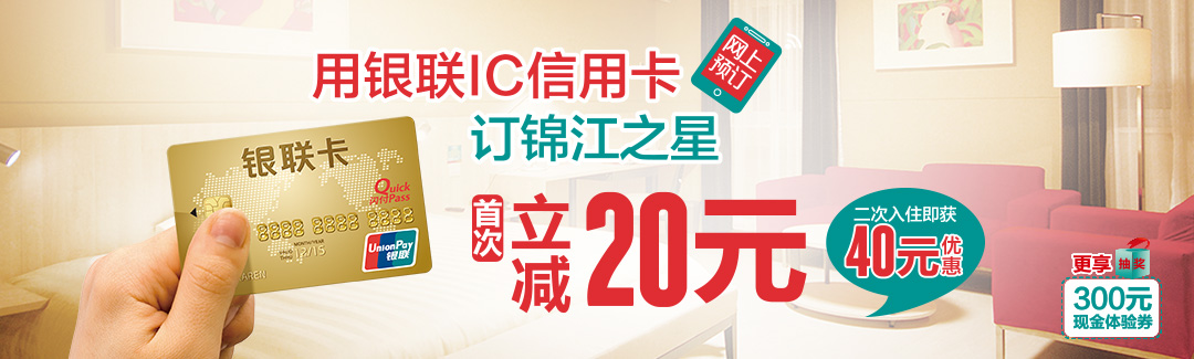 活动期间,持卡人在锦江之星官网、手机APP预订酒店,使用银联信用卡首次完成绑卡,并通过银联在线支付通道完成房费支付,享每单立减20元优惠;非首次绑卡支付享每单立减10元优惠。